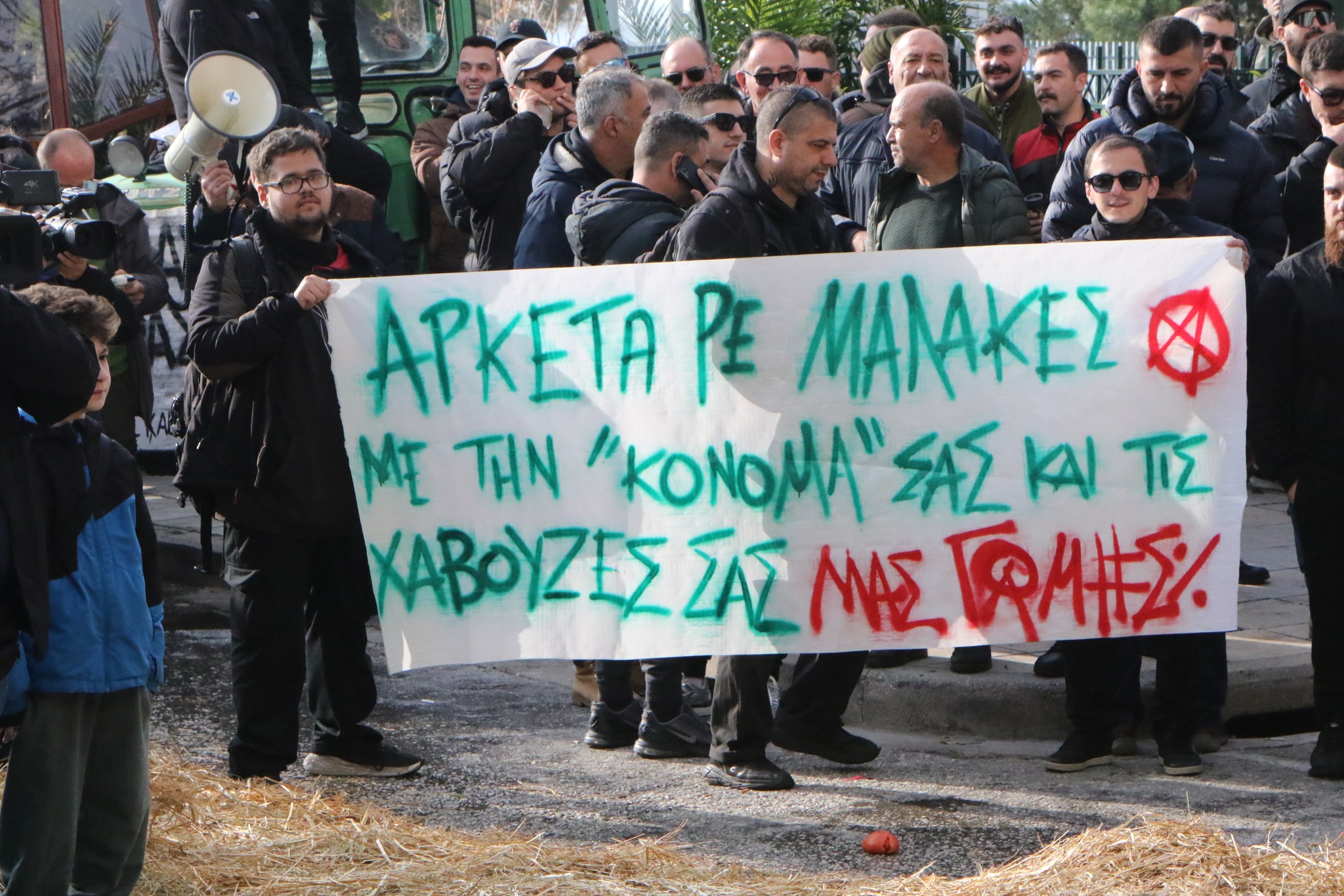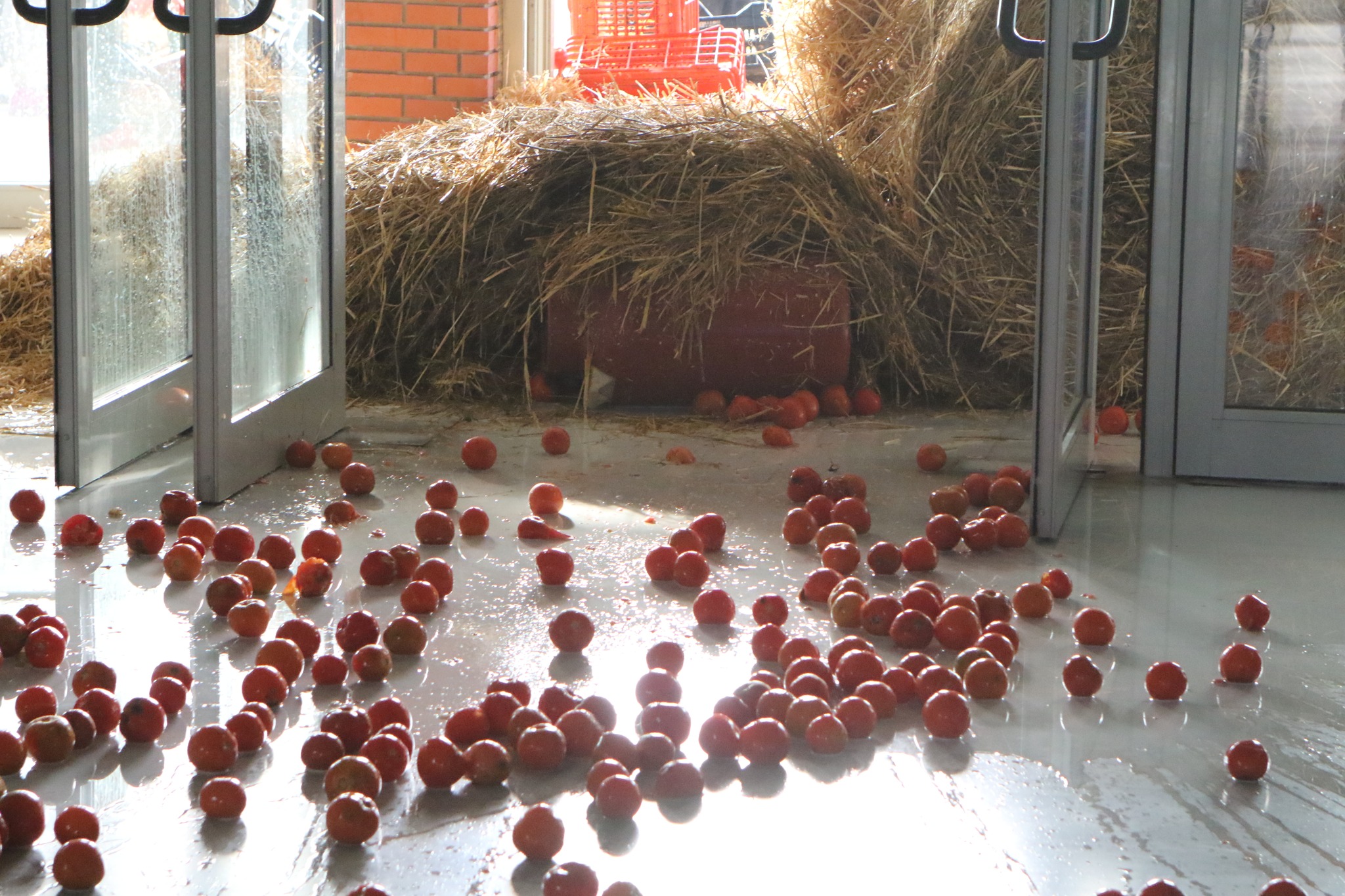 Έκλεισαν την Αντιπεριφέρεια Καβάλας αμπελουργοί, μελισσοκόμοι και αγρότες στην Καβάλα, ρίχνοντας γάλα, άχυρα, ντομάτες και σταφύλια στην πόρτα του κεντρικού κτηρίου.