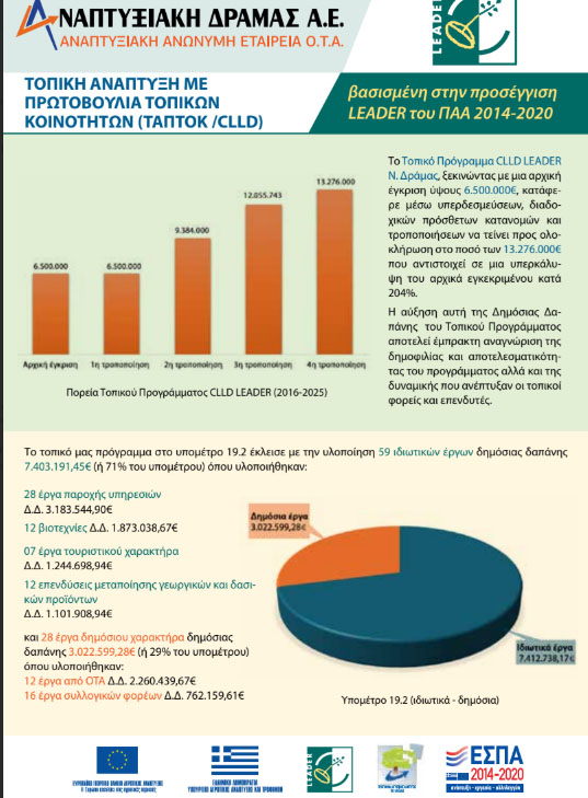 Περισσότερα από 13 εκατομμύρια ευρώ έπεσαν στη Δράμα τα τελευταία 9 χρόνια μέσα από την υλοποίηση σημαντικών έργων από το τοπικό πρόγραμμα LEADER που υλοποιεί η Αναπτυξιακή Εταιρεία Δράμας.