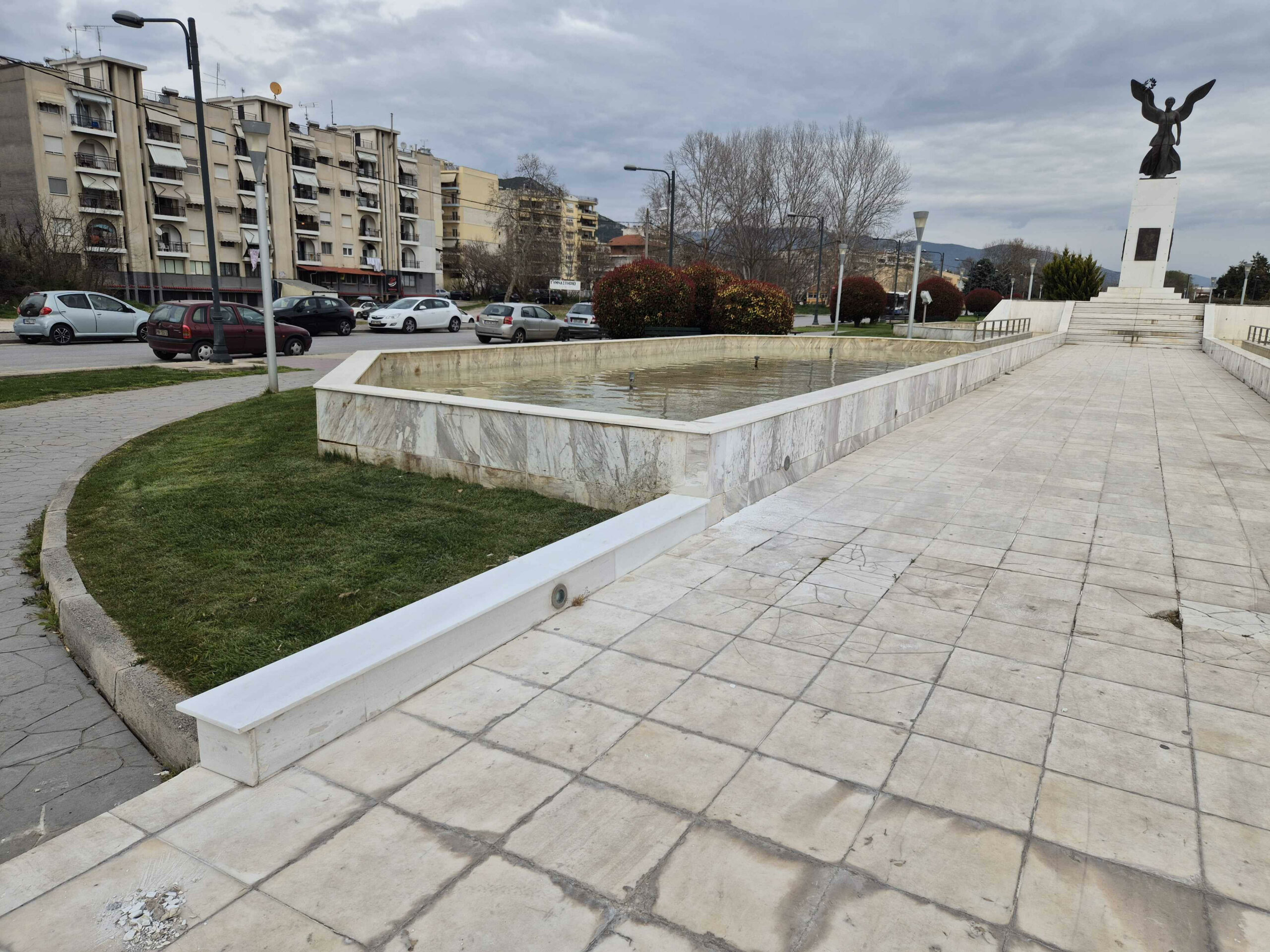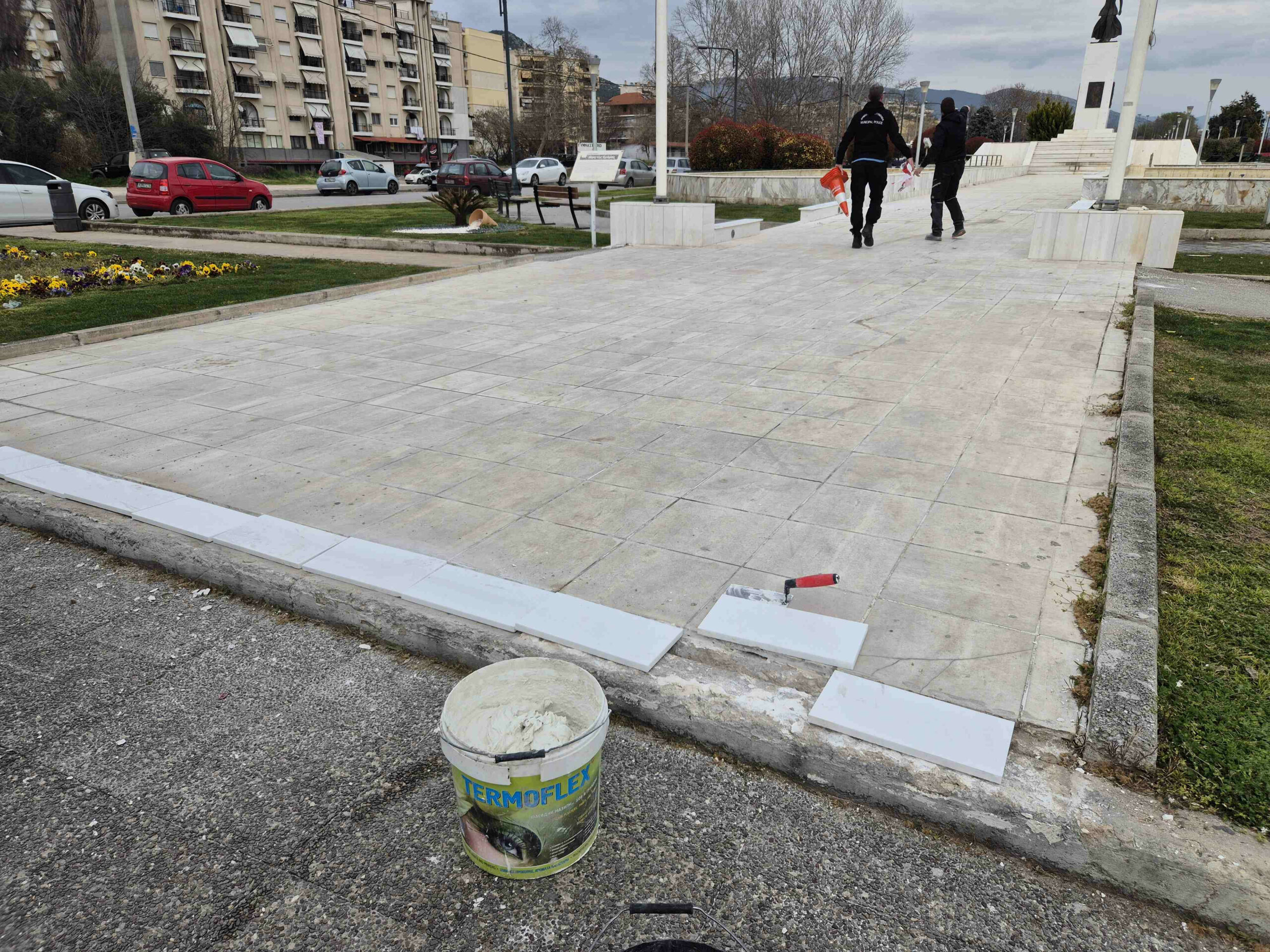 Συνεργεία του Δήμου Δράμας σήμερα, αντικατέστησαν σπασμένα μάρμαρα στο άγαλμα της Νίκης στην περιοχή της Ανάπλασης.