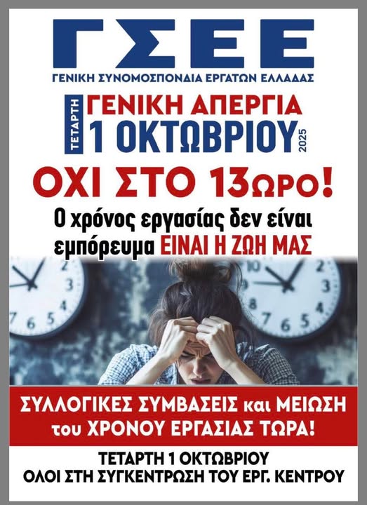 ΓΣΕΕ, ΑΔΕΔΥ και ΠΑΜΕ, διεκδικούν την απόσυρση της κυβερνητικής νομοθετικής πρωτοβουλίας για τα εργασιακά, τη μείωση του χρόνου, την ουσιαστική αύξηση των μισθών, την αποκατάσταση των συλλογικών συμβάσεων, καθώς και την αντιμετώπιση της ακρίβειας και της στεγαστικής κρίση.