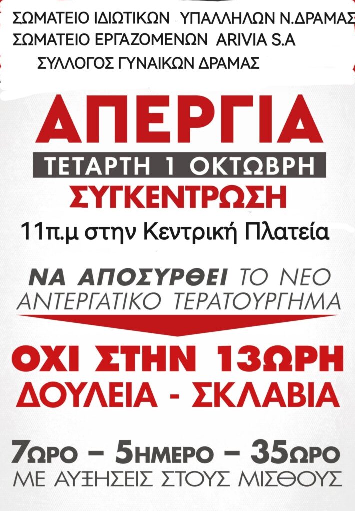 Δράμα: Απεργία αύριο 1 Οκτωβρίου – Στις 11 το πρωί οι συγκεντρώσεις