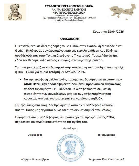 Κινητοποιήσεις πραγματοποιούν σήμερα Τετάρτη οι εργαζόμενοι στις δομές e-ΕΦΚΑ Δράμας και όλης της περιφέρειας Ανατολικής Μακεδονίας και Θράκης με αφορμή την ένοπλη επίθεση που δέχτηκε συνάδελφος τους στην Αθήνα από τον 89χρονο άνδρα.