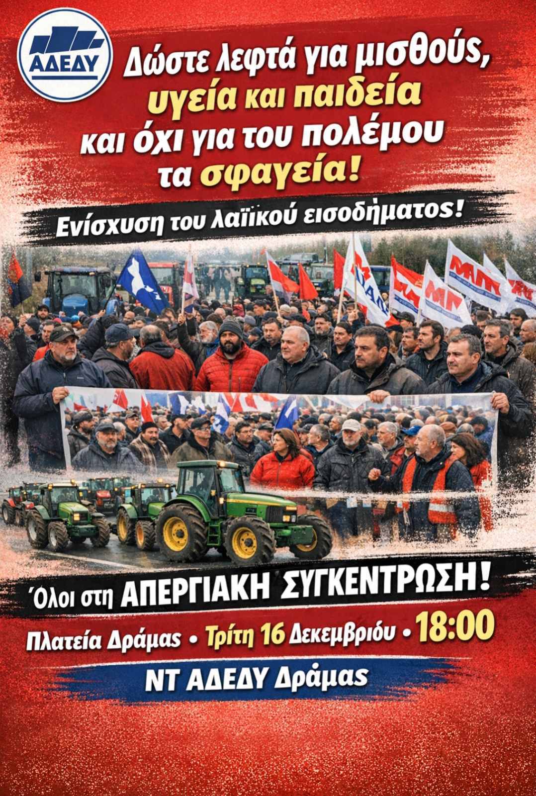 Το Νομαρχιακό Τμήμα ΑΔΕΔΥ Δράμας συμμετέχει στην 24ωρη απεργιακή κινητοποίηση της Τρίτης 16 Δεκεμβρίου και καλεί όλους τους εργαζόμενους του Δημοσίου στη συγκέντρωση που θα πραγματοποιηθεί στις 18:00, στην Πλατεία Ελευθερίας Δράμας.