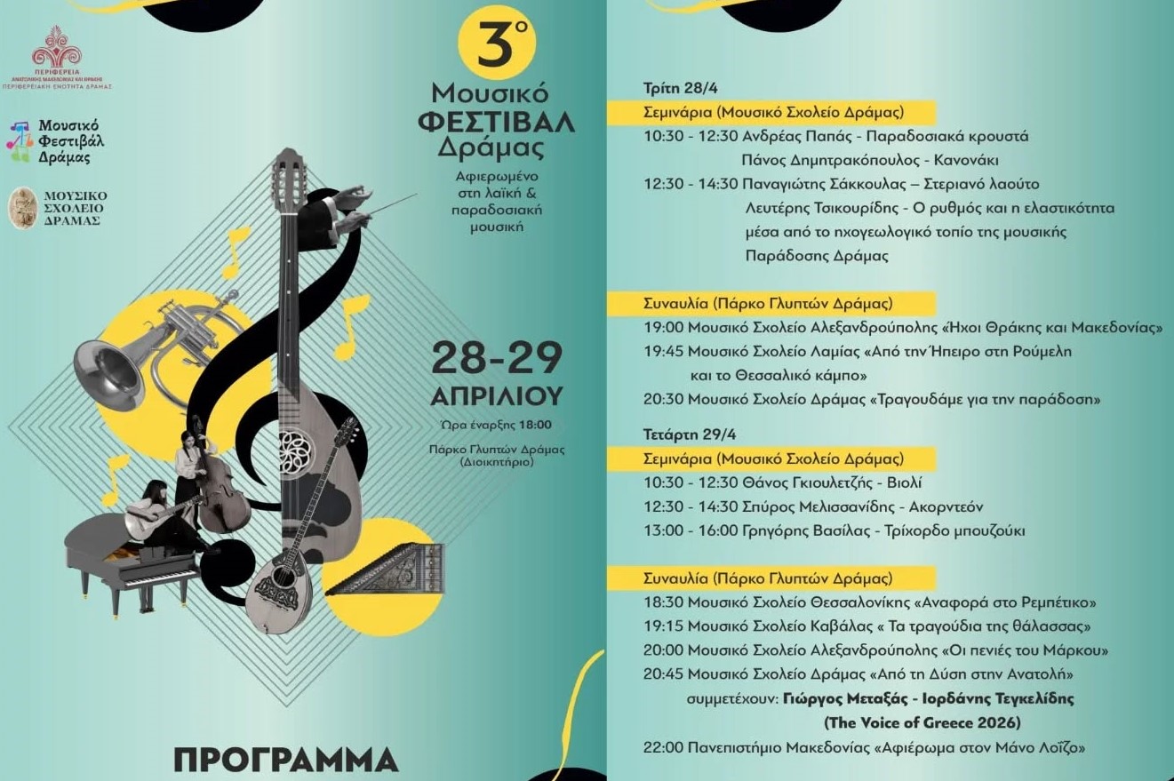 Αύριο και μεθαύριο, 28 και 29 Απριλίου θα διεξαχθεί στη Δράμα το 3ο Μουσικό Φεστιβάλ αφιερωμένο στην λαϊκή και παραδοσιακή μουσική.