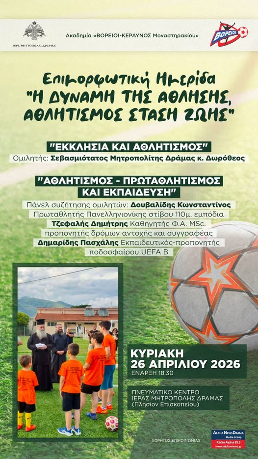 Επιμορφωτική ημερίδα με θέματα “Εκκλησία και Αθλητισμός” και “Αθλητισμός-Πρωταθλητισμός και Εκπαίδευση” διοργανώνει η Ακαδημία Βόρειοι – Κεραυνός Μοναστηρακίου την Κυριακή 26 Απριλίου στις 6.30 το απόγευμα, στο Πνευματικό Κέντρο της Μητρόπολης Δράμας