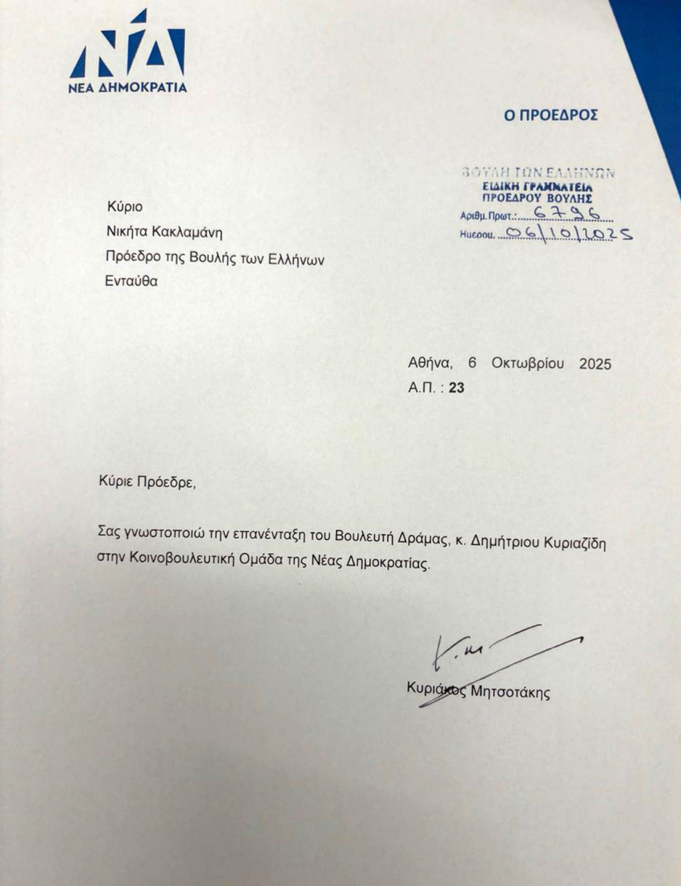 Η επιστολή του πρωθυπουργού στον Πρόεδρο της Βουλής για την επανένταξη Κυριαζίδη