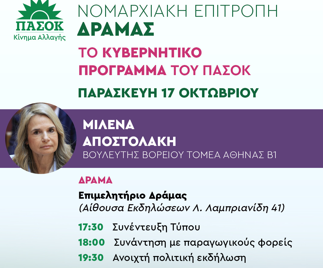 Την Δράμα θα επισκεφτεί αύριο Παρασκευή 17 Οκτωβρίου, η βουλευτής του ΠΑΣΟΚ, πρώην υφυπουργός Ανάπτυξης και Αγροτικής Ανάπτυξης και Τροφίμων, Μιλένα Αποστολάκη.